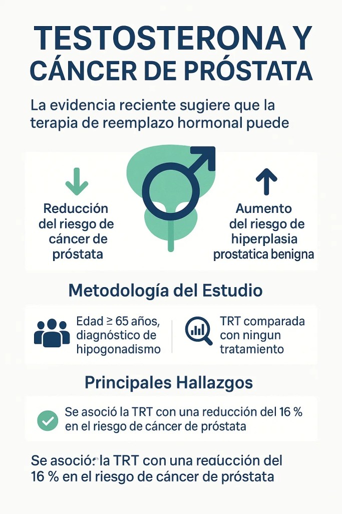 - La TRT se asoció con una reducción del 16 % en el riesgo de cáncer de próstata (HR 0.84; IC 95 % 0.82–0.86).
