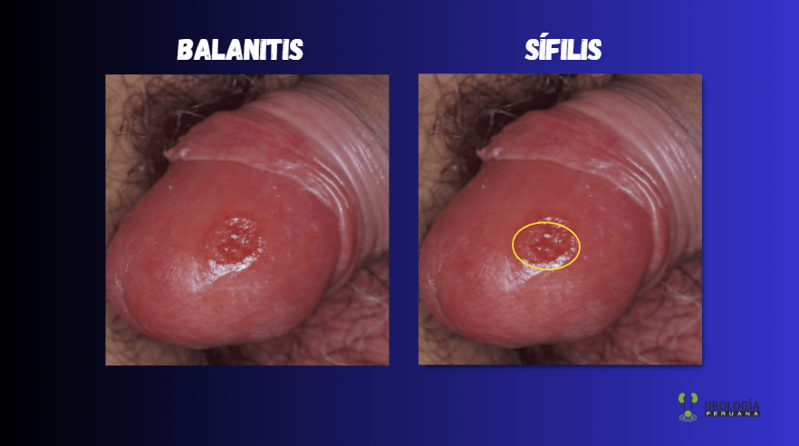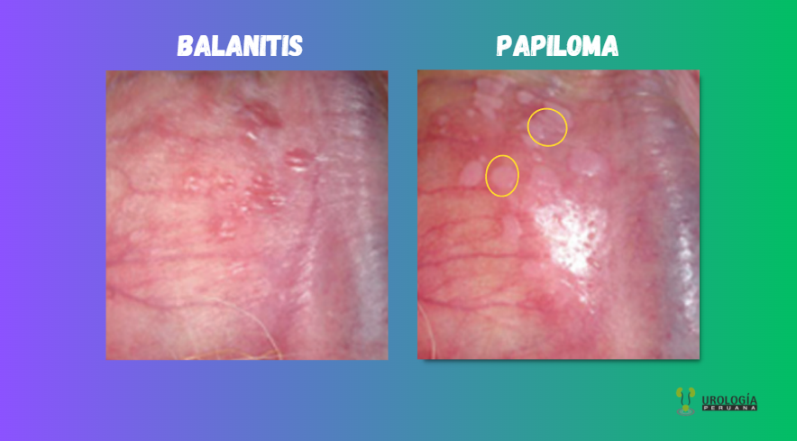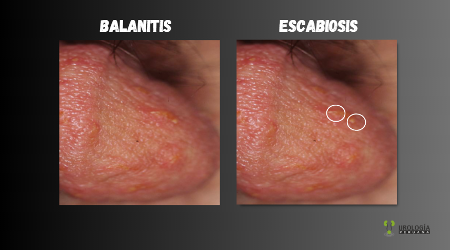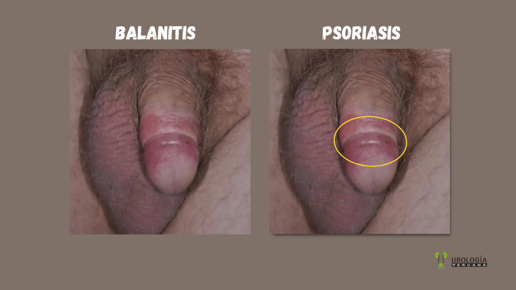 La balanitis psoriásica es la manifestación de la psoriasis en el glande o prepucio, caracterizada por placas bien delimitadas, eritematosas, generalmente sin escamas evidentes por la humedad local. No es infecciosa ni contagiosa y suele asociarse a antecedentes personales o familiares de psoriasis, respondiendo a tratamiento tópico específico.La linfangitis peneana serpiginosa es una inflamación benigna y autolimitada de los vasos linfáticos superficiales del pene, que se manifiesta como un cordón indurado, no doloroso, de trayecto serpenteante. Suele aparecer tras actividad sexual intensa o traumatismo local y no se asocia a infección ni enfermedad de transmisión sexual.Balanitis por Candida, Complicada. Se muestra como eritema rojo brillante, superficie húmeda o macerada, con placas blanquecinas desprendibles y, a veces, pequeñas pápulas satélite alrededor de la lesión principal.La balanitis sifilítica suele manifestarse como una lesión eritematosa o erosiva, a veces indurada, poco dolorosa, que puede pasar desapercibida en fases iniciales. Con frecuencia se asocia a chancro sifilítico u otras lesiones cutáneas y siempre requiere confirmación serológica.La balanitis por sarna se produce debido al ácaro Sarcoptes scabiei, que puede afectar la zona genital, causando prurito intenso, eritema, pápulas y excoriaciones en el glande y el prepucio.La balanitis por liquen rojo anular es una forma de liquen plano que afecta el glande, caracterizada por lesiones anulares o policíclicas, rojizas-violáceas, bien delimitadas. No es infecciosa ni contagiosa y suele ser crónica, requiriendo tratamiento específico.La balanitis por papiloma plano presenta lesiones planas, poco elevadas, de color similar a la piel o levemente eritematosas en glande o prepucio. Su visualización mejora con el test del ácido acético, que produce blanqueamiento transitorio de las lesiones sugestivas de VPH.La balanitis circinada se caracteriza por lesiones anulares o en “mapa”, bien delimitadas, eritematosas, localizadas en el glande. Suele asociarse al síndrome de Reiter (artritis reactiva) y no es infecciosa directa.La balanitis herpética se manifiesta con vesículas pequeñas y dolorosas sobre piel enrojecida del glande o prepucio, que luego se rompen y forman úlceras superficiales. Suele acompañarse de ardor, dolor y a veces fiebre, y es causada por el virus del herpes simple.