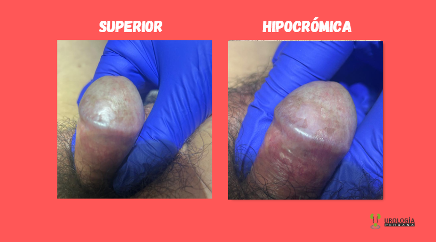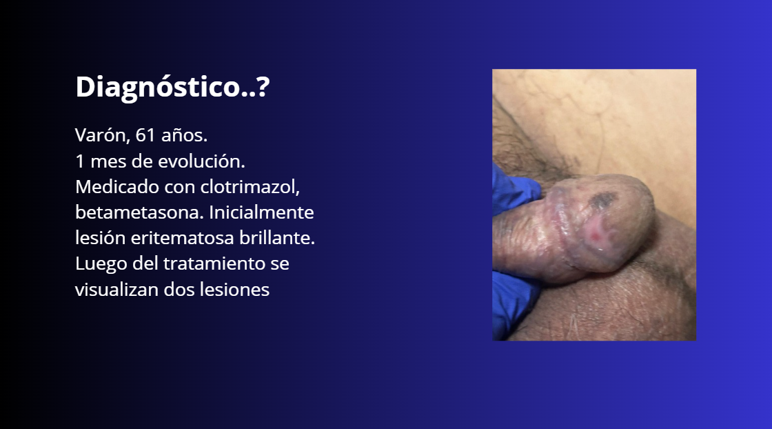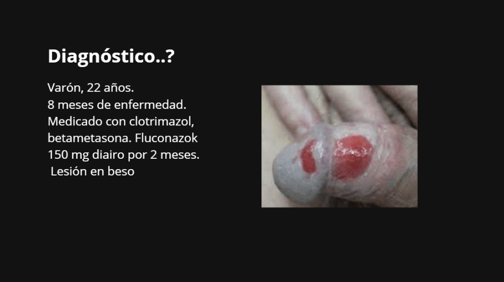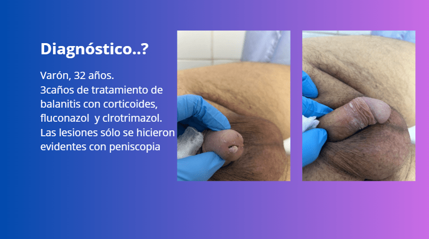 La balanitis psoriásica es la manifestación de la psoriasis en el glande o prepucio, caracterizada por placas bien delimitadas, eritematosas, generalmente sin escamas evidentes por la humedad local. No es infecciosa ni contagiosa y suele asociarse a antecedentes personales o familiares de psoriasis, respondiendo a tratamiento tópico específico.La linfangitis peneana serpiginosa es una inflamación benigna y autolimitada de los vasos linfáticos superficiales del pene, que se manifiesta como un cordón indurado, no doloroso, de trayecto serpenteante. Suele aparecer tras actividad sexual intensa o traumatismo local y no se asocia a infección ni enfermedad de transmisión sexual.Balanitis por Candida, Complicada. Se muestra como eritema rojo brillante, superficie húmeda o macerada, con placas blanquecinas desprendibles y, a veces, pequeñas pápulas satélite alrededor de la lesión principal.La balanitis sifilítica suele manifestarse como una lesión eritematosa o erosiva, a veces indurada, poco dolorosa, que puede pasar desapercibida en fases iniciales. Con frecuencia se asocia a chancro sifilítico u otras lesiones cutáneas y siempre requiere confirmación serológica.La balanitis por sarna se produce debido al ácaro Sarcoptes scabiei, que puede afectar la zona genital, causando prurito intenso, eritema, pápulas y excoriaciones en el glande y el prepucio.La balanitis por liquen rojo anular es una forma de liquen plano que afecta el glande, caracterizada por lesiones anulares o policíclicas, rojizas-violáceas, bien delimitadas. No es infecciosa ni contagiosa y suele ser crónica, requiriendo tratamiento específico.La balanitis por papiloma plano presenta lesiones planas, poco elevadas, de color similar a la piel o levemente eritematosas en glande o prepucio. Su visualización mejora con el test del ácido acético, que produce blanqueamiento transitorio de las lesiones sugestivas de VPH.La balanitis circinada se caracteriza por lesiones anulares o en “mapa”, bien delimitadas, eritematosas, localizadas en el glande. Suele asociarse al síndrome de Reiter (artritis reactiva) y no es infecciosa directa.La balanitis herpética se manifiesta con vesículas pequeñas y dolorosas sobre piel enrojecida del glande o prepucio, que luego se rompen y forman úlceras superficiales. Suele acompañarse de ardor, dolor y a veces fiebre, y es causada por el virus del herpes simple.RTratado con corticoides de alta potencia por 6 meses. Nótese la lesión boanquecina, aceto negativa. Fue sometido a biopsia. ¿Cuál creen que fue el diagnóstico?