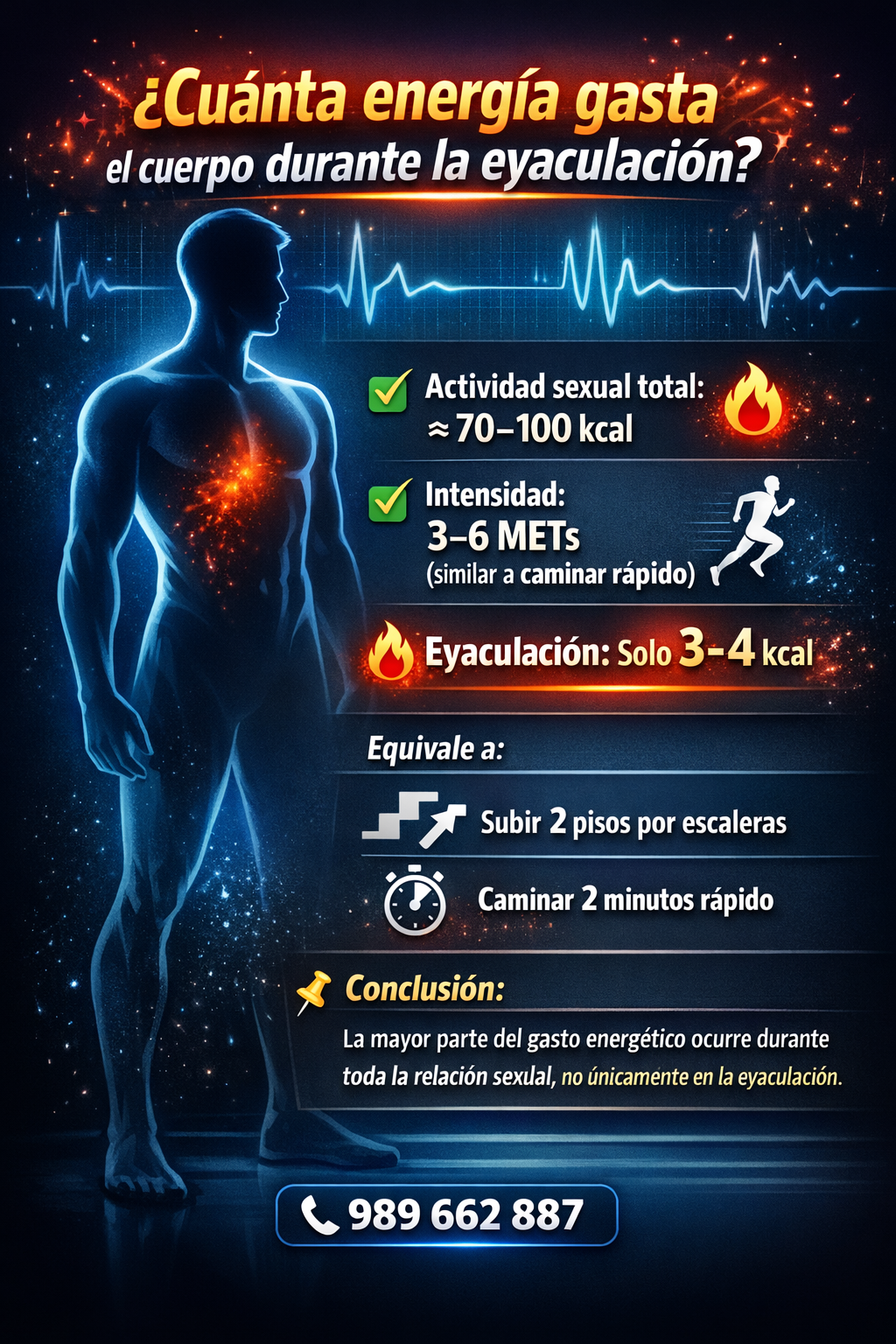 La eyaculación forma parte del gasto energético total que ocurre durante la actividad sexual completa, pero representa solo una pequeña fracción del esfuerzo físico.