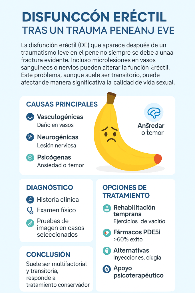 La disfunción eréctil secundaria a trauma peneano leve es un cuadro multifactorial, en el que confluyen alteraciones vasculares, nerviosas y psicológicas. Aunque la mayoría de los pacientes presenta una recuperación espontánea, la rehabilitación temprana y un abordaje diagnóstico-terapéutico integral resultan claves para optimizar la recuperación de la función eréctil.